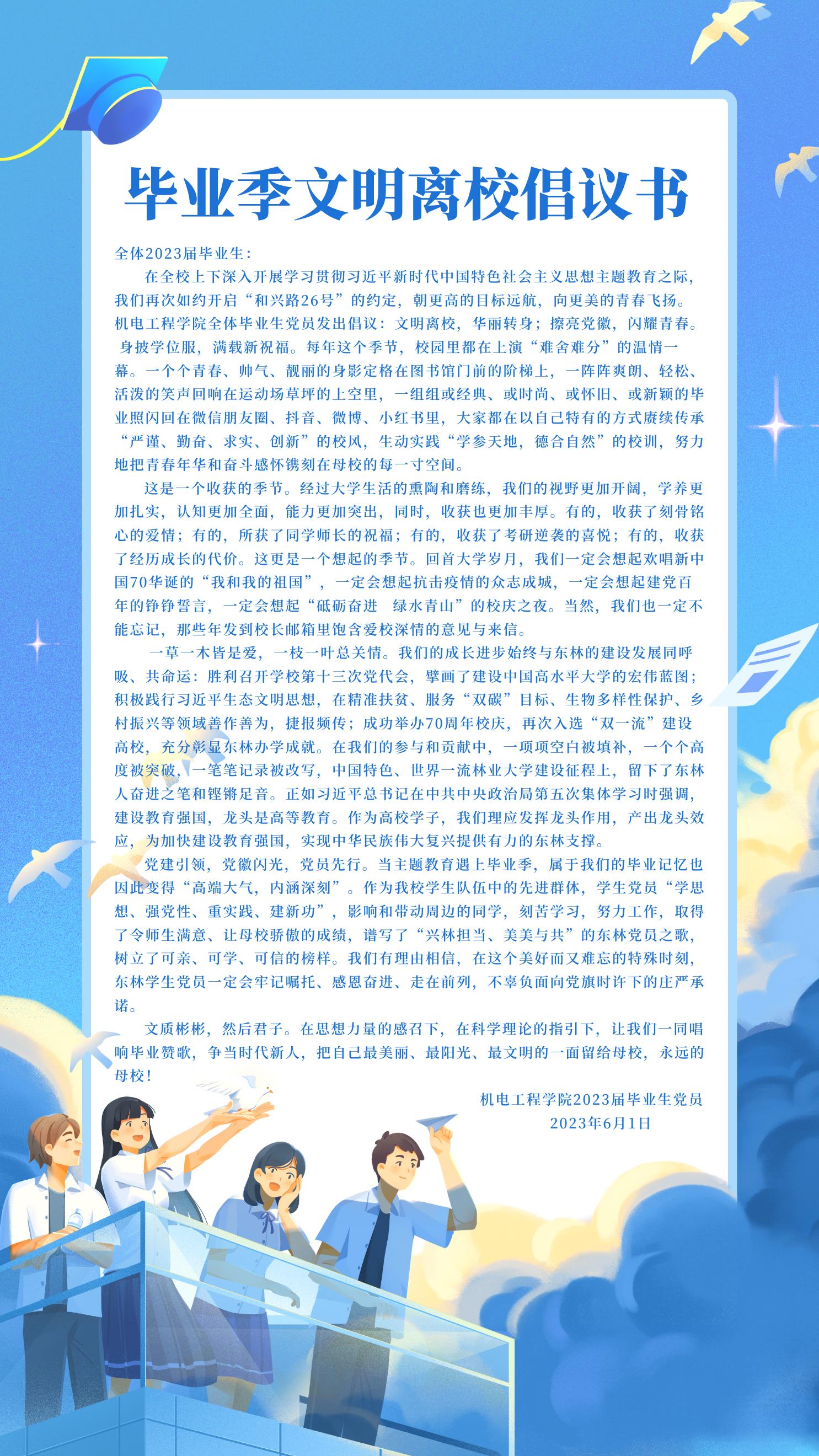 在全校上下深入开展学习贯彻习近平新时代中国特色社会主义思想主题教育之际,我们再次如约开启“和兴路26号”的约定,朝更高的目标远航,向更美的青春飞扬。正规滚球app平台官网全体毕业生党员发出倡议:文明离校,华丽转身;擦亮党徽,闪耀青春。